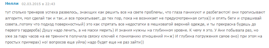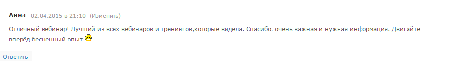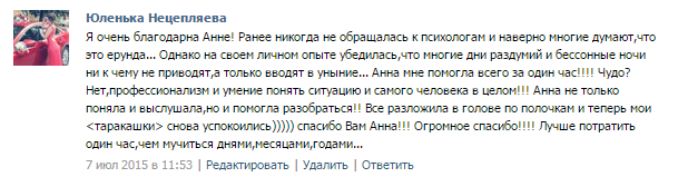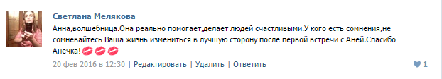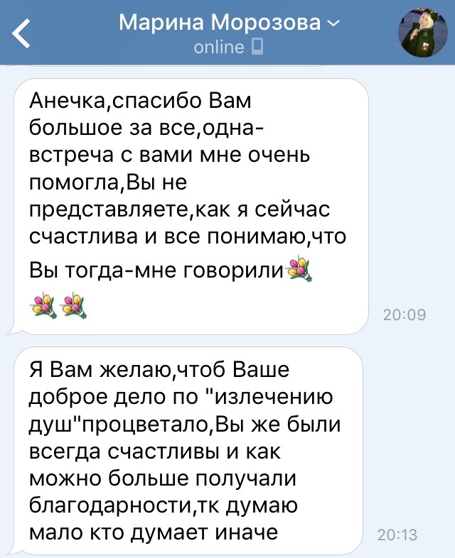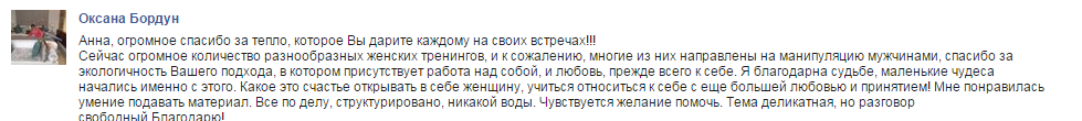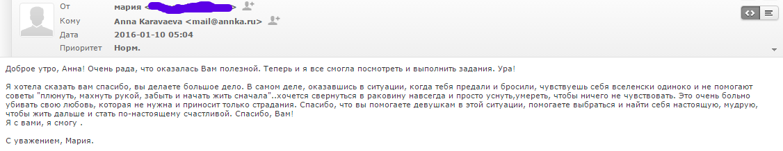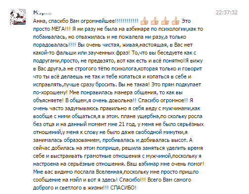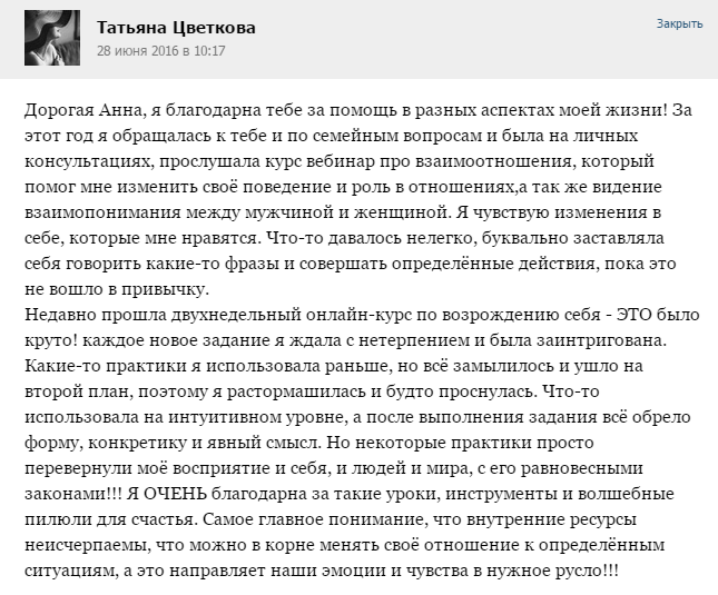 Аня! Спасибо Вам за то, что Вы есть! За Ваши волшебные курсы, за Ваши чудодейственные слова! Вы можете подобрать путь к любому сердцу и излечить его от боли! Вы помогаете нам жить и дышать! Вы учите нас строить планы, открывать сердца и создавать свою новую счастливую жизнь! После такого количества проделанной с Вами работы я просто обязана стать счастливой! Бесконечно благодарна Вам!! Счастья и успехов Вам в наступающем году!! И пусть все Ваши мечты исполнятся!