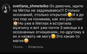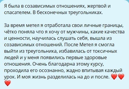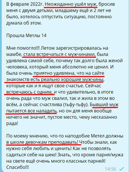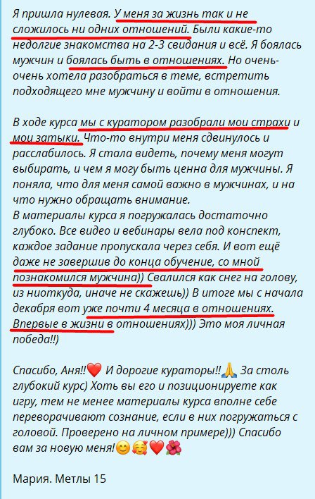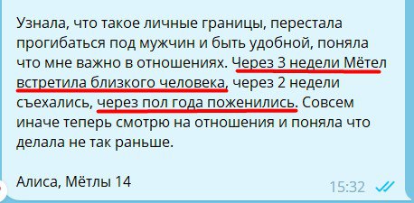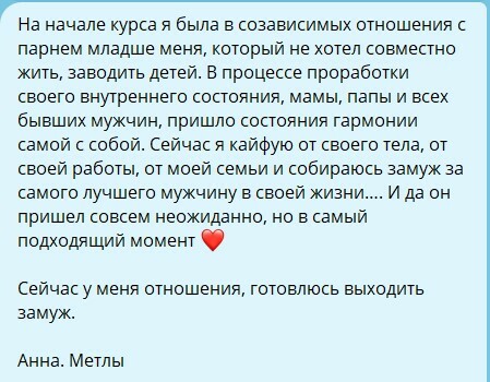 Теперь со мной знакомятся мужчины с целью создания семьи, а не для секса. Это безумно меня радует пожалуй, на сегодняшний день, это большая победа, привлекать достойных мужчин. Я уверена, что это только начало моих перемен после «Метлы», дальше – лучше! Так же есть желание ещё поработать над собой и своей самооценкой, дабы окончательно закрепить эффект ☺️ Ещё раз БЛАГОДАРЮ Вас, Анна!!! Ваши труды не напрасны!